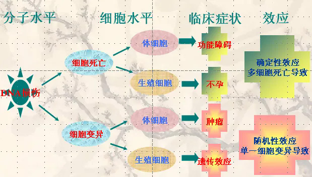 1.隨機性效應(yīng):無劑量閾值有害效應(yīng)的嚴(yán)重程度與受照劑量大小無關(guān),任何微小的劑量也可引起效應(yīng),只是發(fā)生的幾率極其微小而已。如:致癌效應(yīng)(癌癥 、白血?。?; 遺傳效應(yīng)(損傷發(fā)生在具有遺傳信息的功能細(xì)胞上,發(fā)生的效應(yīng)將顯現(xiàn)在受照者的后代身上)。
