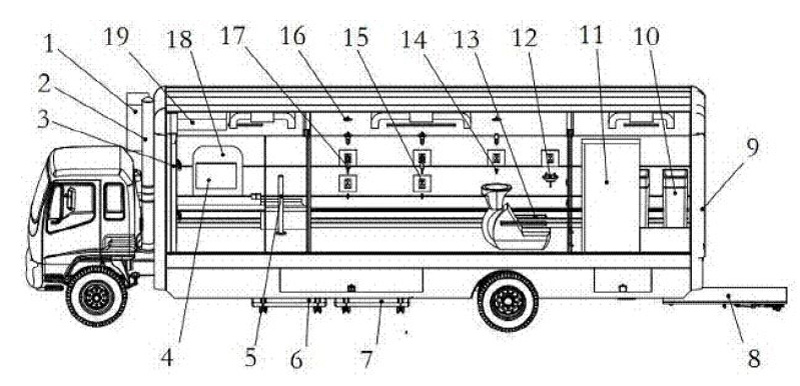 1. 核化污染洗消車;包括供電系統(tǒng)、照明系統(tǒng)、空調(diào)系統(tǒng)、供水及溫控系統(tǒng)、洗消液供給及溫控系統(tǒng)。其特征在于:還包括車廂、水箱、洗消液箱、升降平臺(tái)、水管路入口、電器控制線入口;所述裝置結(jié)構(gòu)皆集成安裝在一部車上。